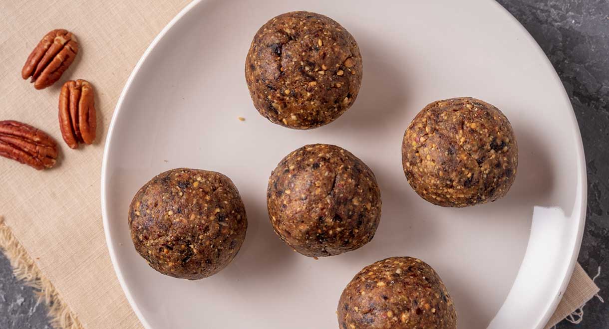 These pecan, date and coffee balls are a good source of fibre and quality fats to give you a perfect boost as a pre- or post-workout snack and are also super easy to make.