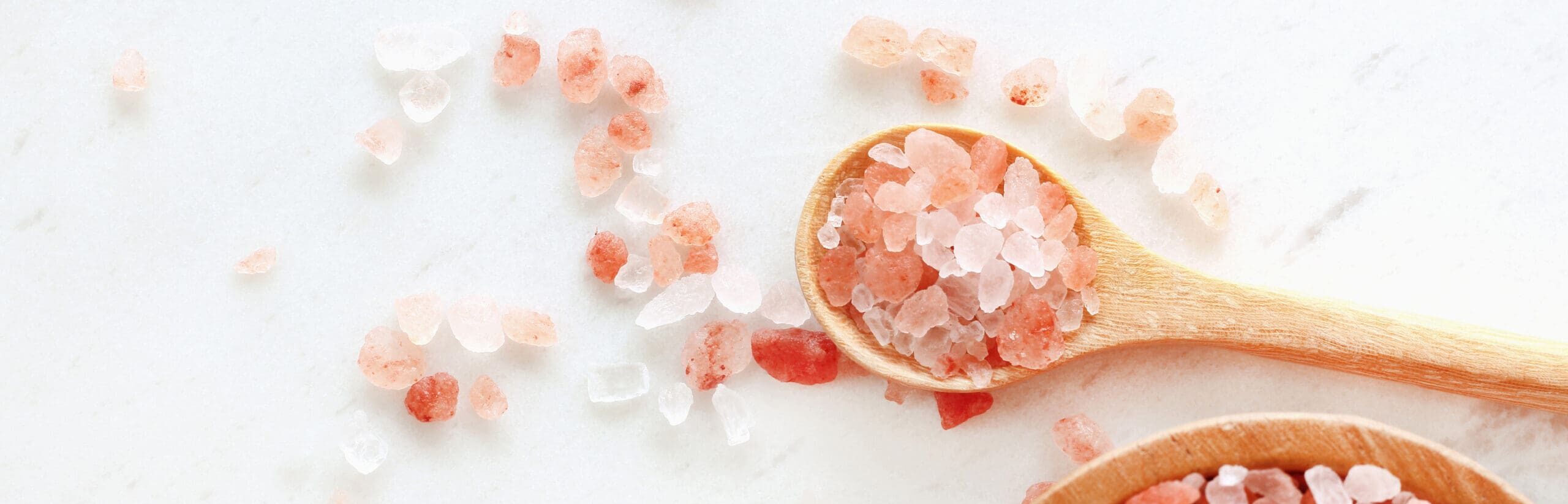 top view of himalayan pink rock salt in wooden bowl and spoon on white marble table.