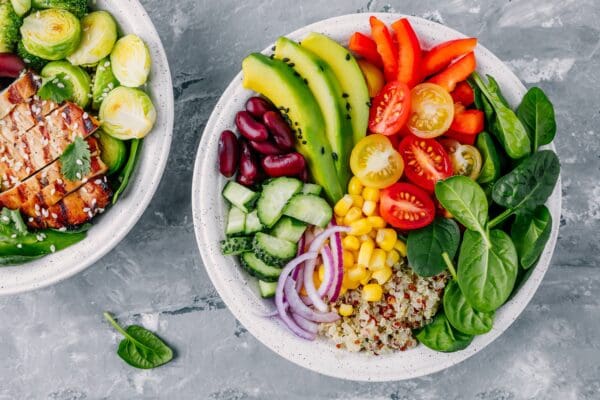 Healthy vegan lunch Buddha bowl. Avocado, quinoa, tomato, cucumber, red beans, spinach, red onion and red paprika vegetables salad.