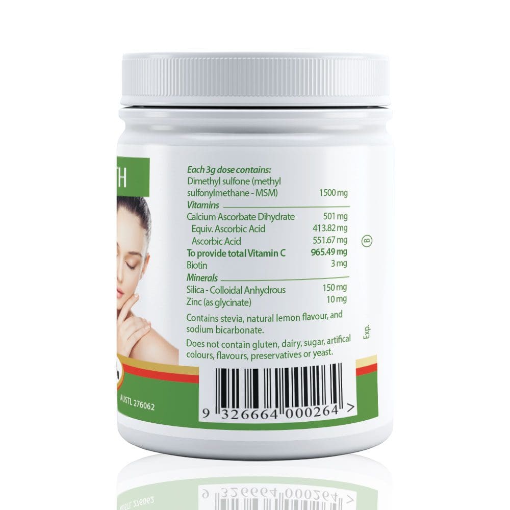 - MSM (methylsulfonylmethane): Is a natural sulphur-containing compound. Sulphur is required to produce collagen and keratin which are needed to maintain strong hair and healthy skin and nails. Healthy collagen production is what protects our skin from getting saggy, wrinkled, dry or cracked. MSM supports the body to form new joint and muscle tissue while reducing inflammation that leads to swelling and stiffness. MSM helps to rebuild the digestive tract lining and can heal leaky gut syndrome by stopping particles leaking from the gut into the bloodstream.